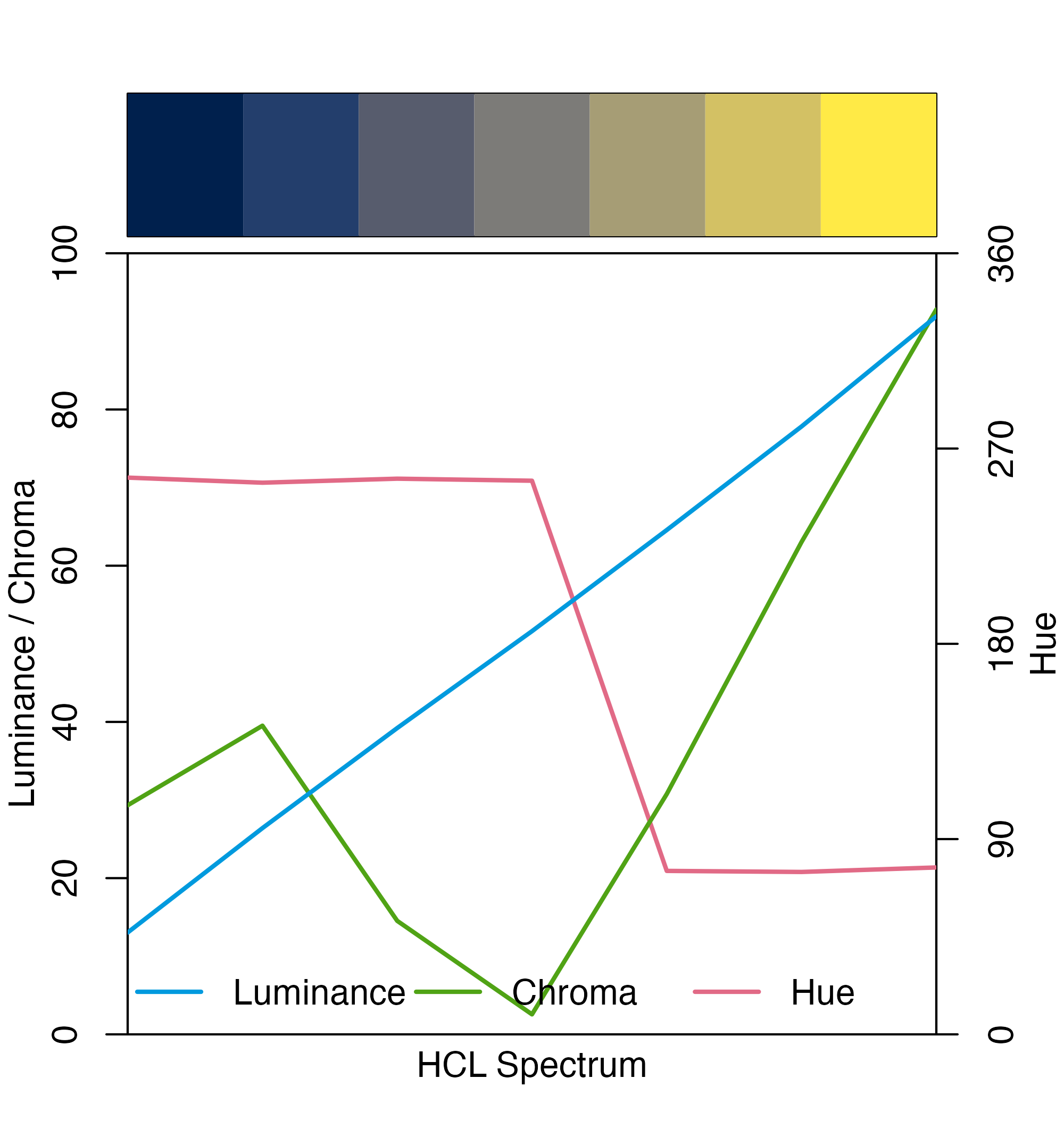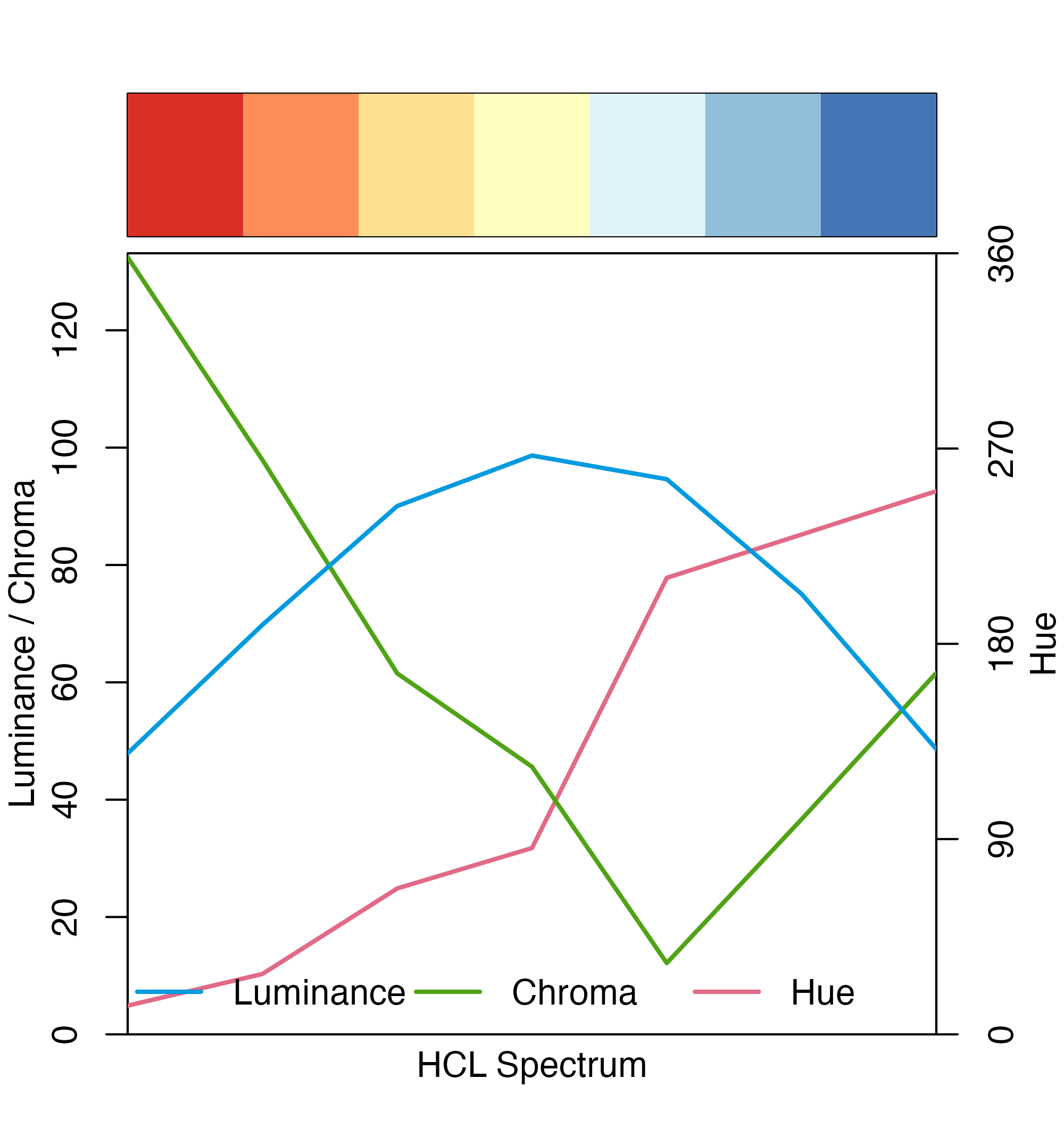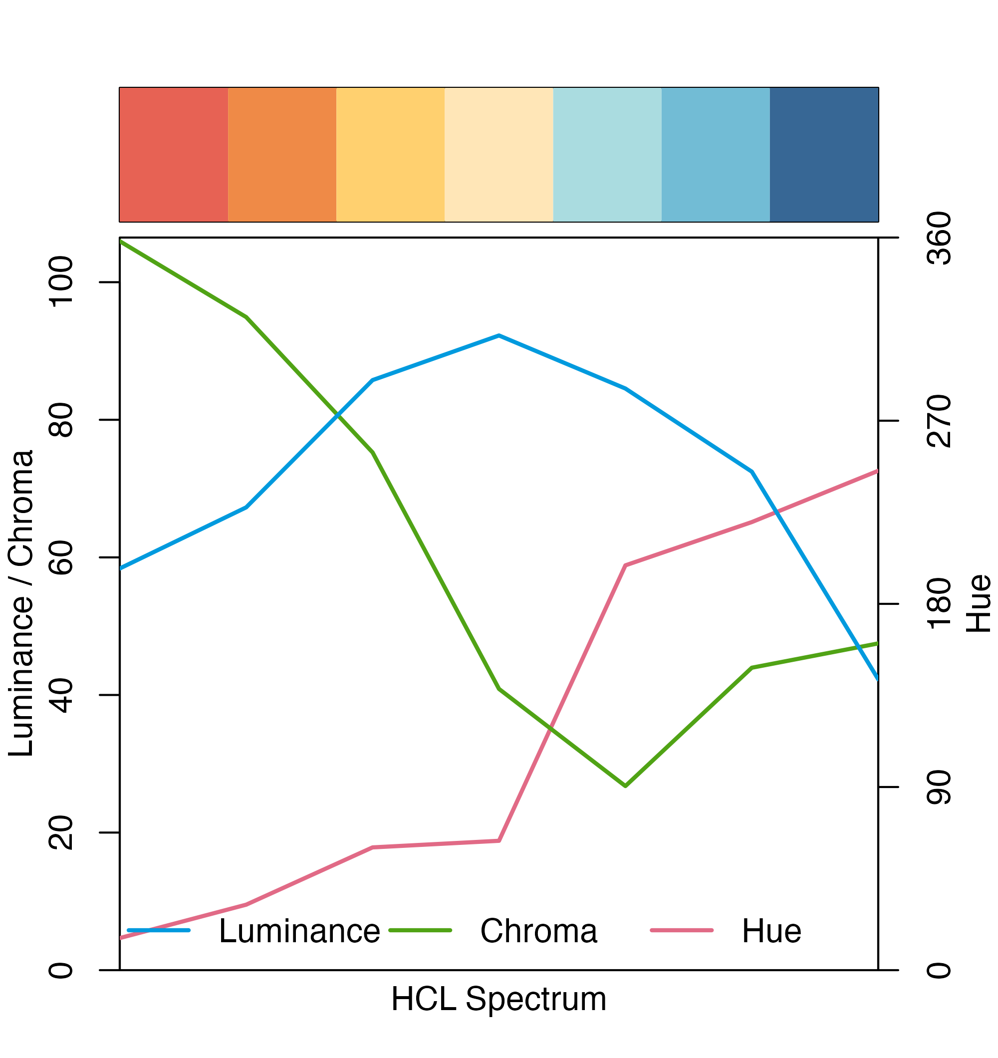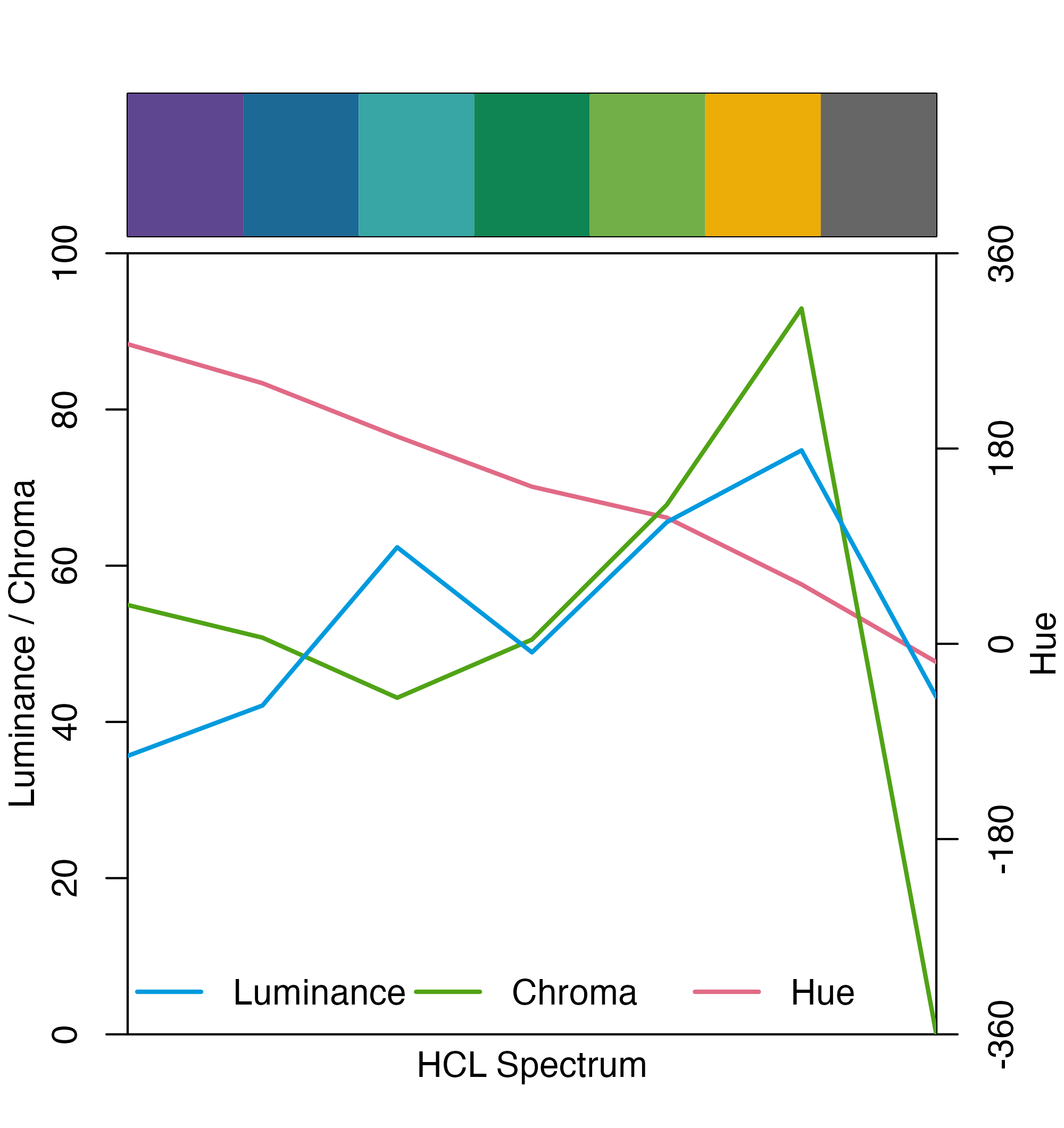 space = "HCL", the colors are transformed to HCL, (polarLUV), the luminance component L is adjusted, and then the colors are transformed back to a hexadecimal RGB string.If