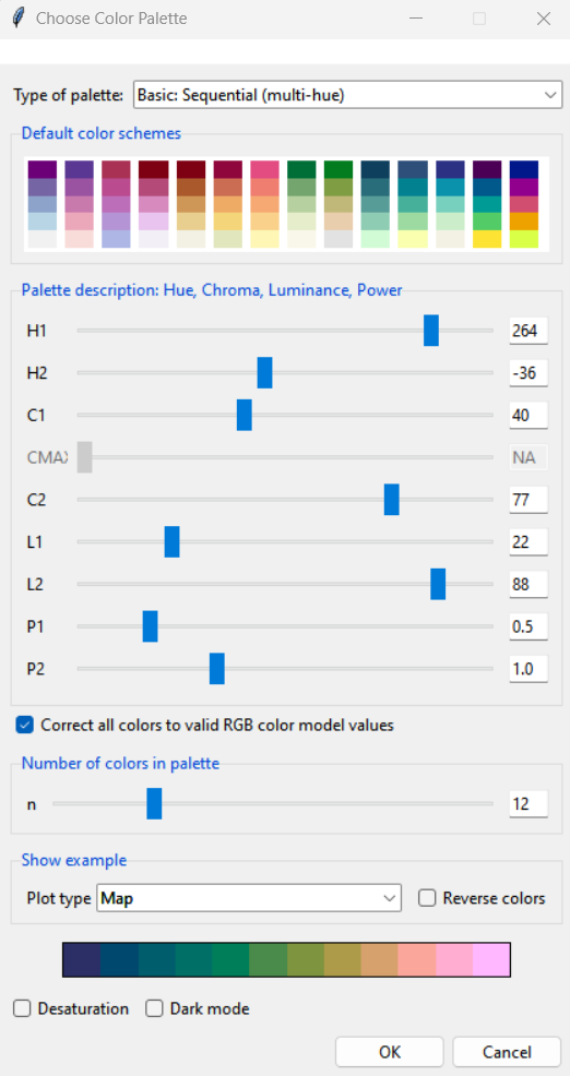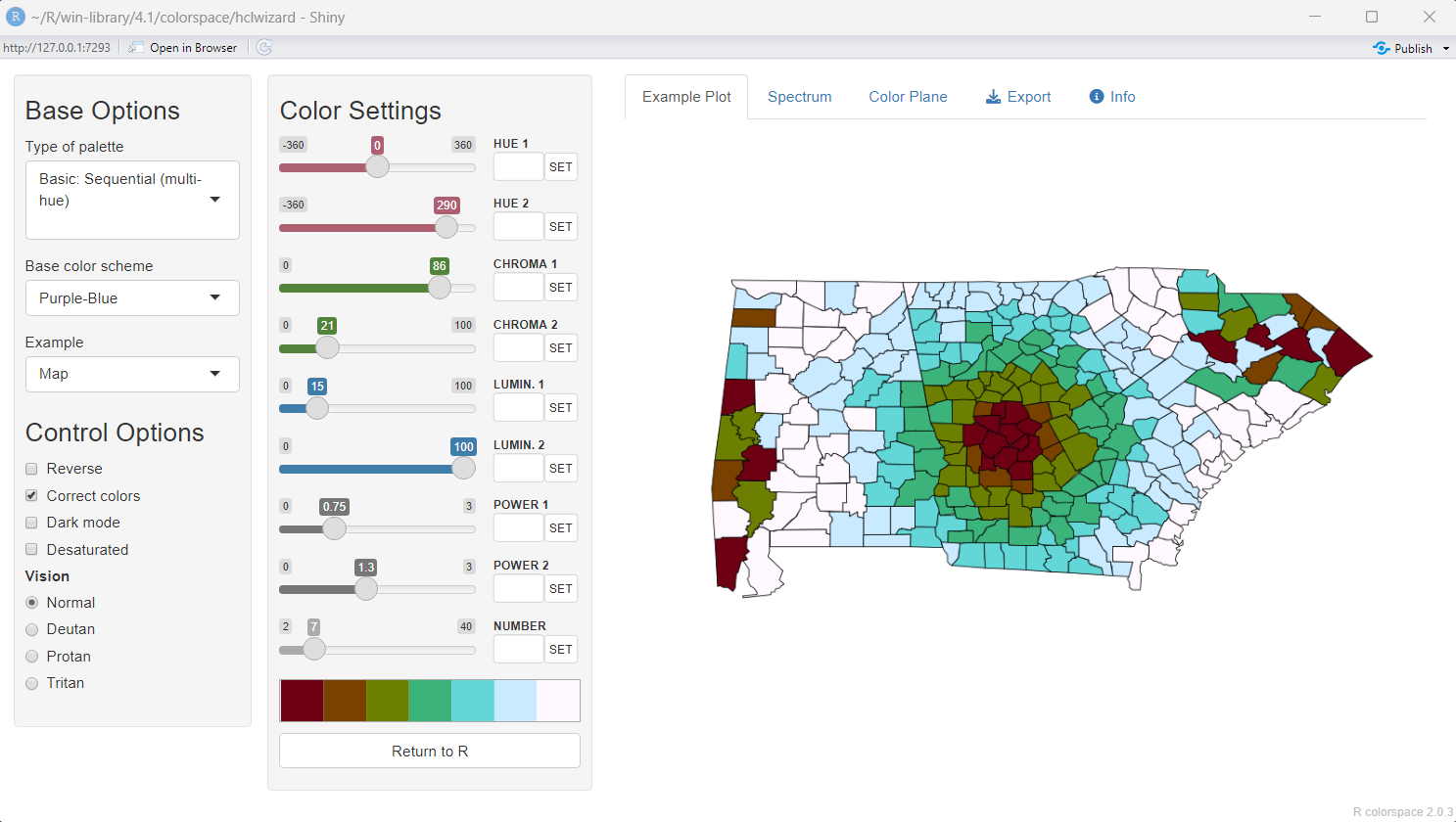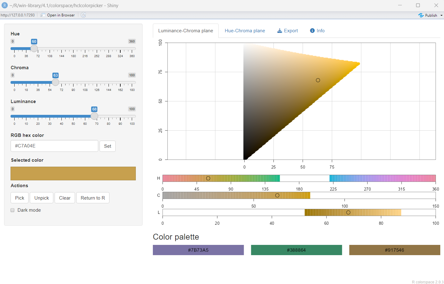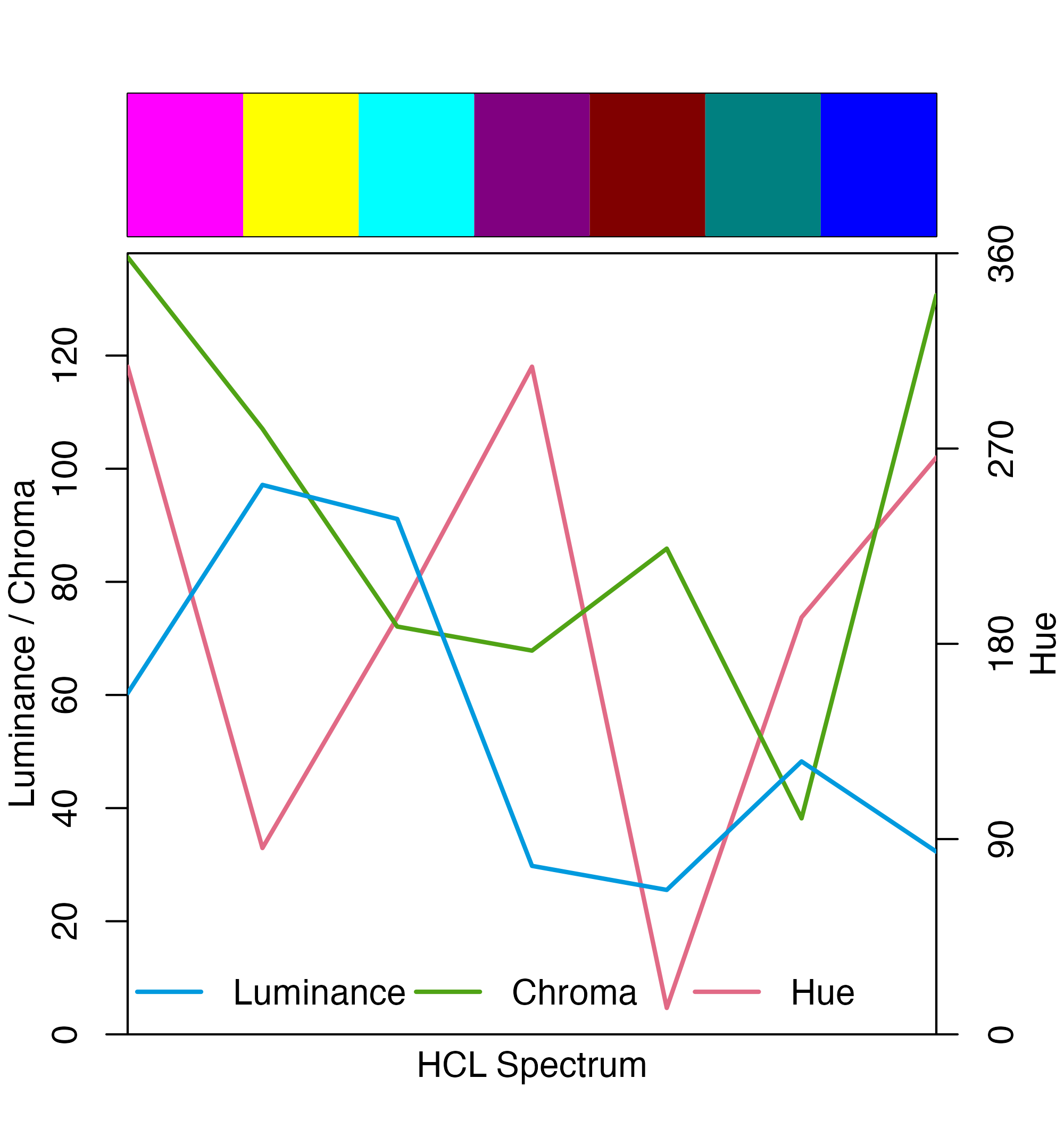 space = "HCL", the colors are transformed to HCL, (polarLUV), the luminance component L is adjusted, and then the colors are transformed back to a hexadecimal RGB string.If