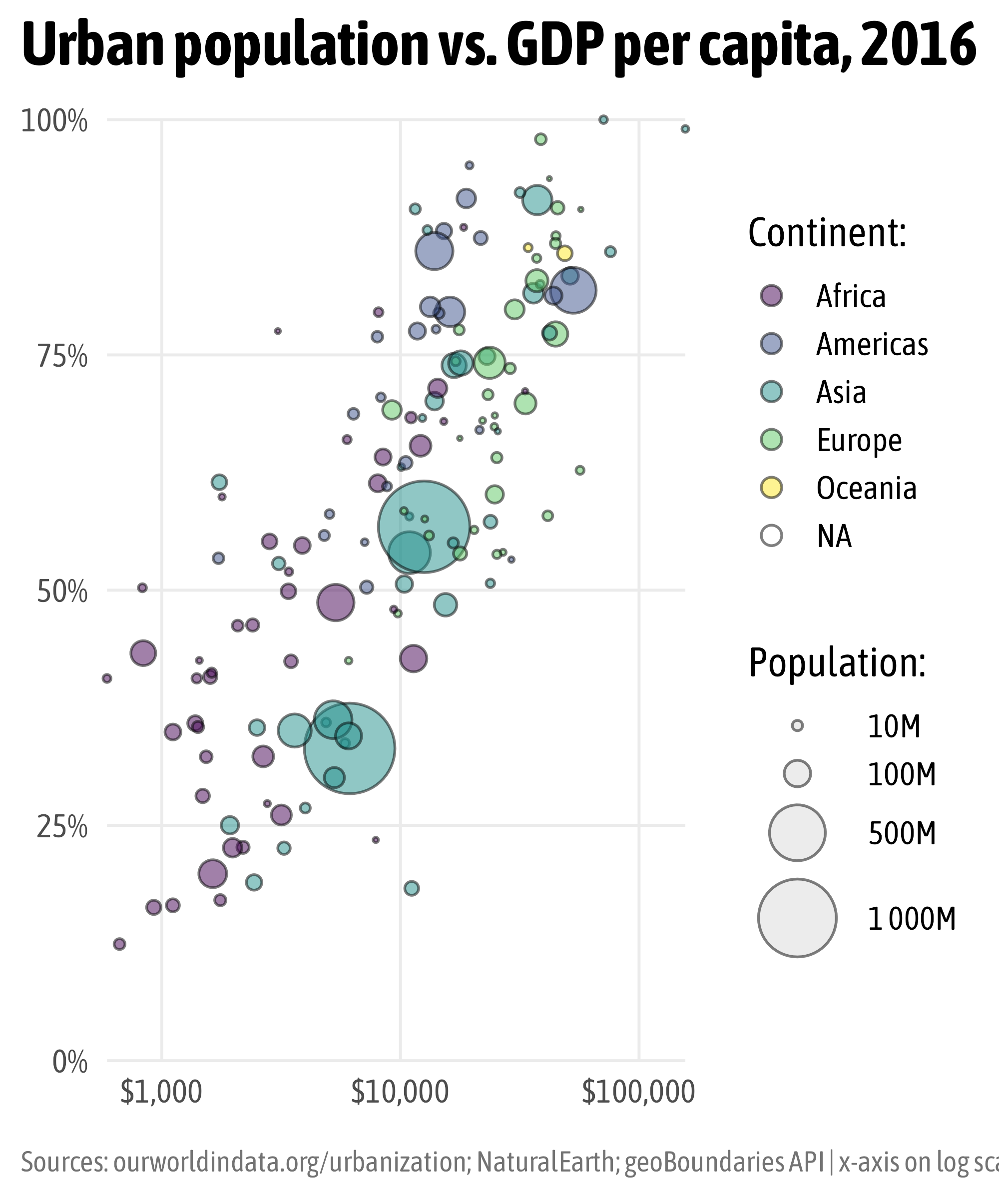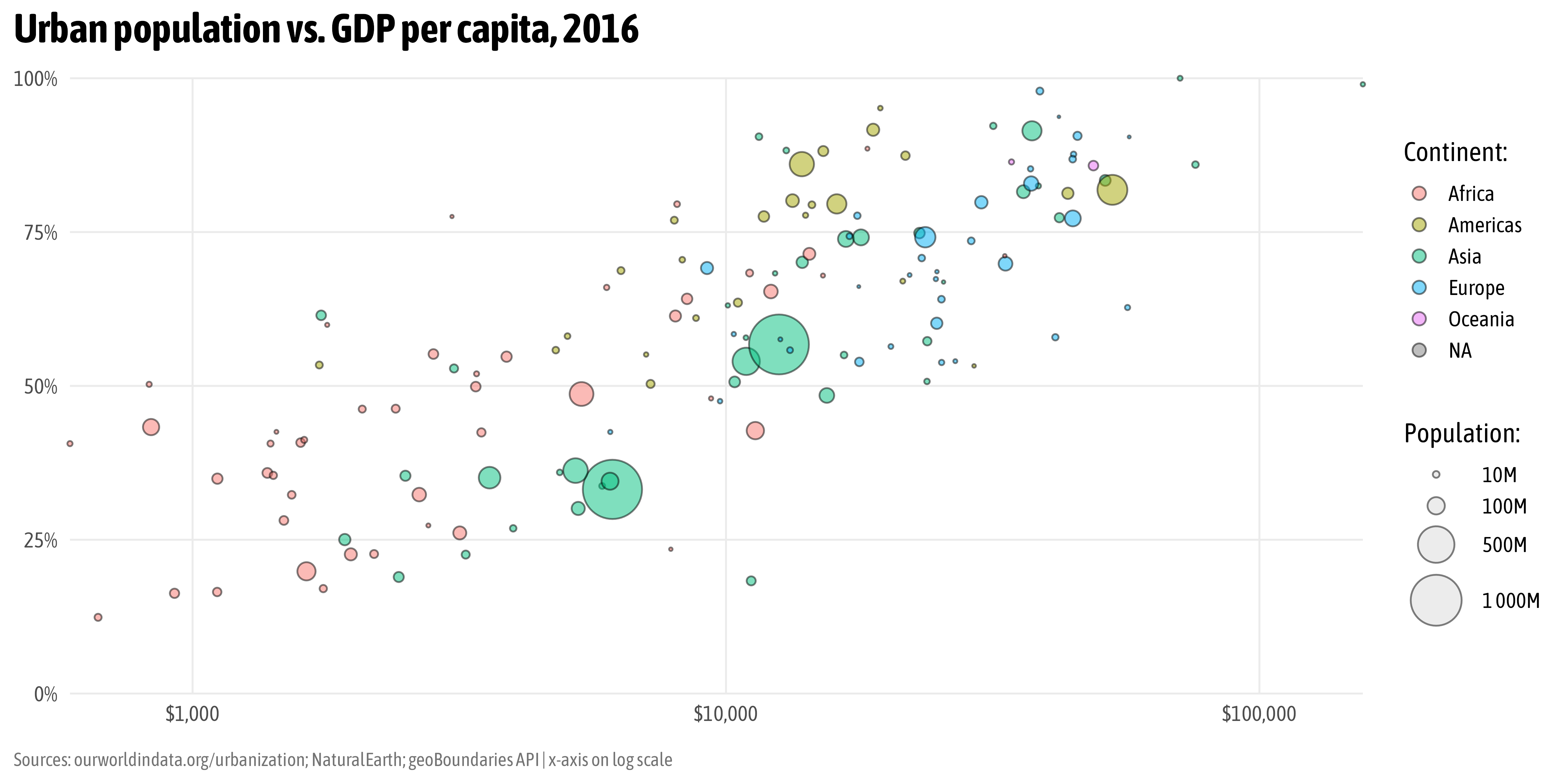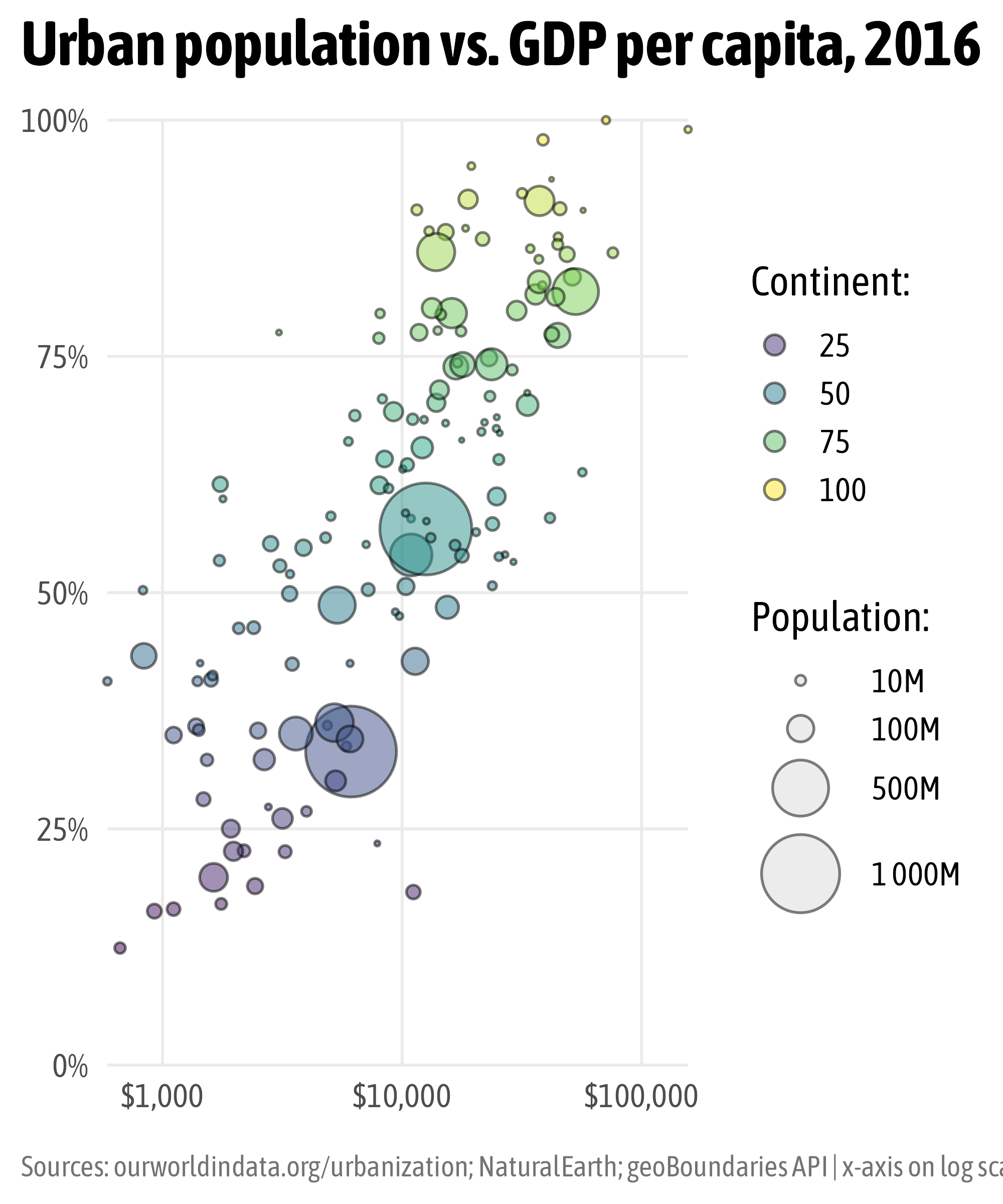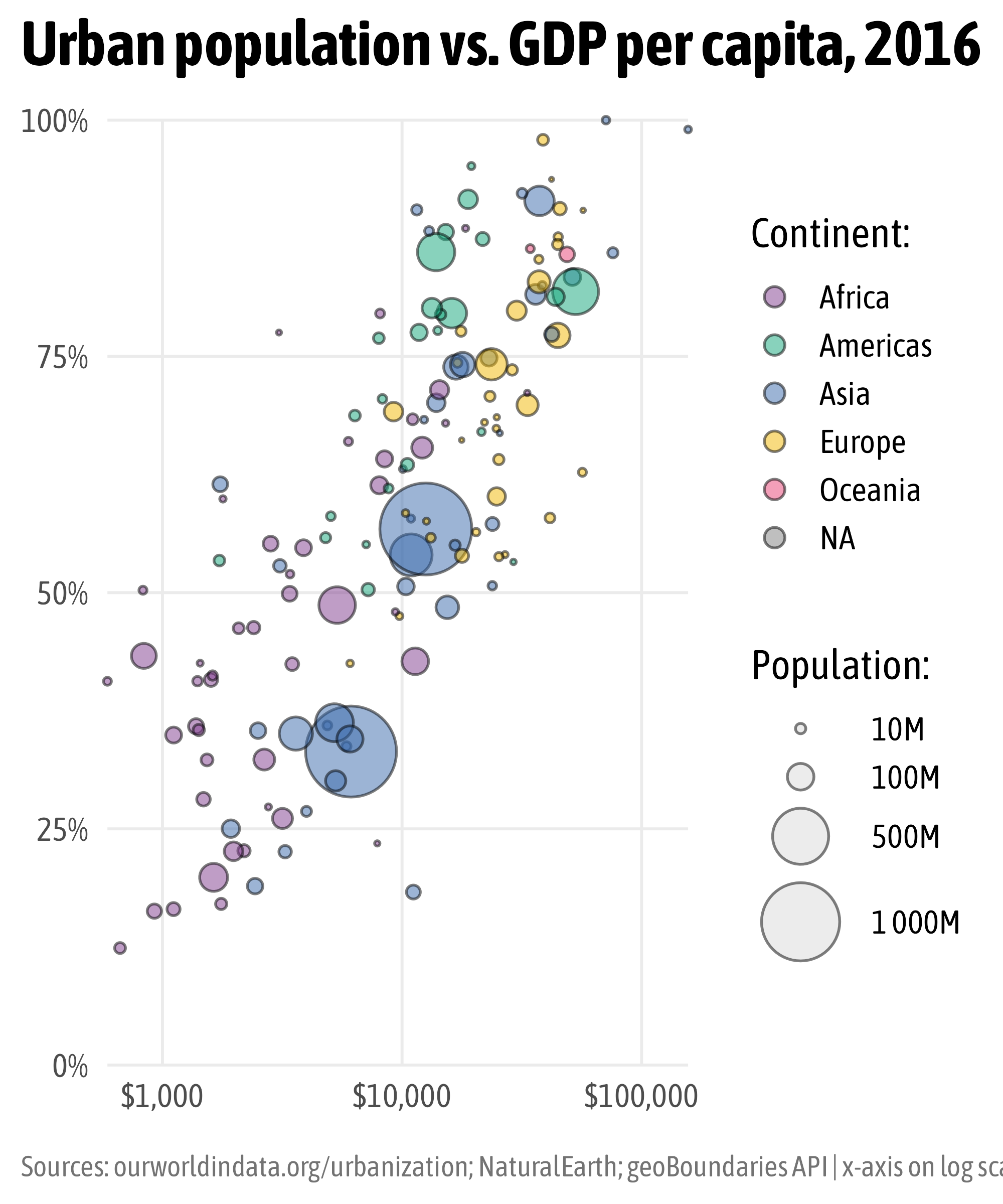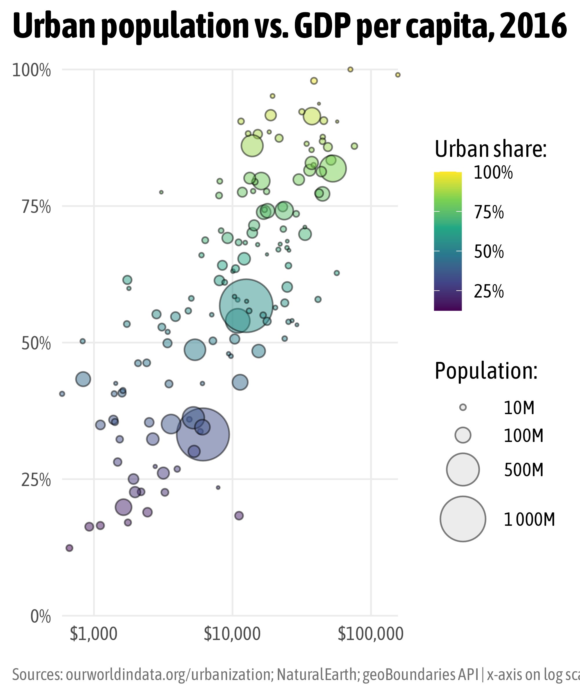 caption = "Sources: ourworldindata.org/urbanization; NaturalEarth; geoBoundaries API | x-axis on log scale") +