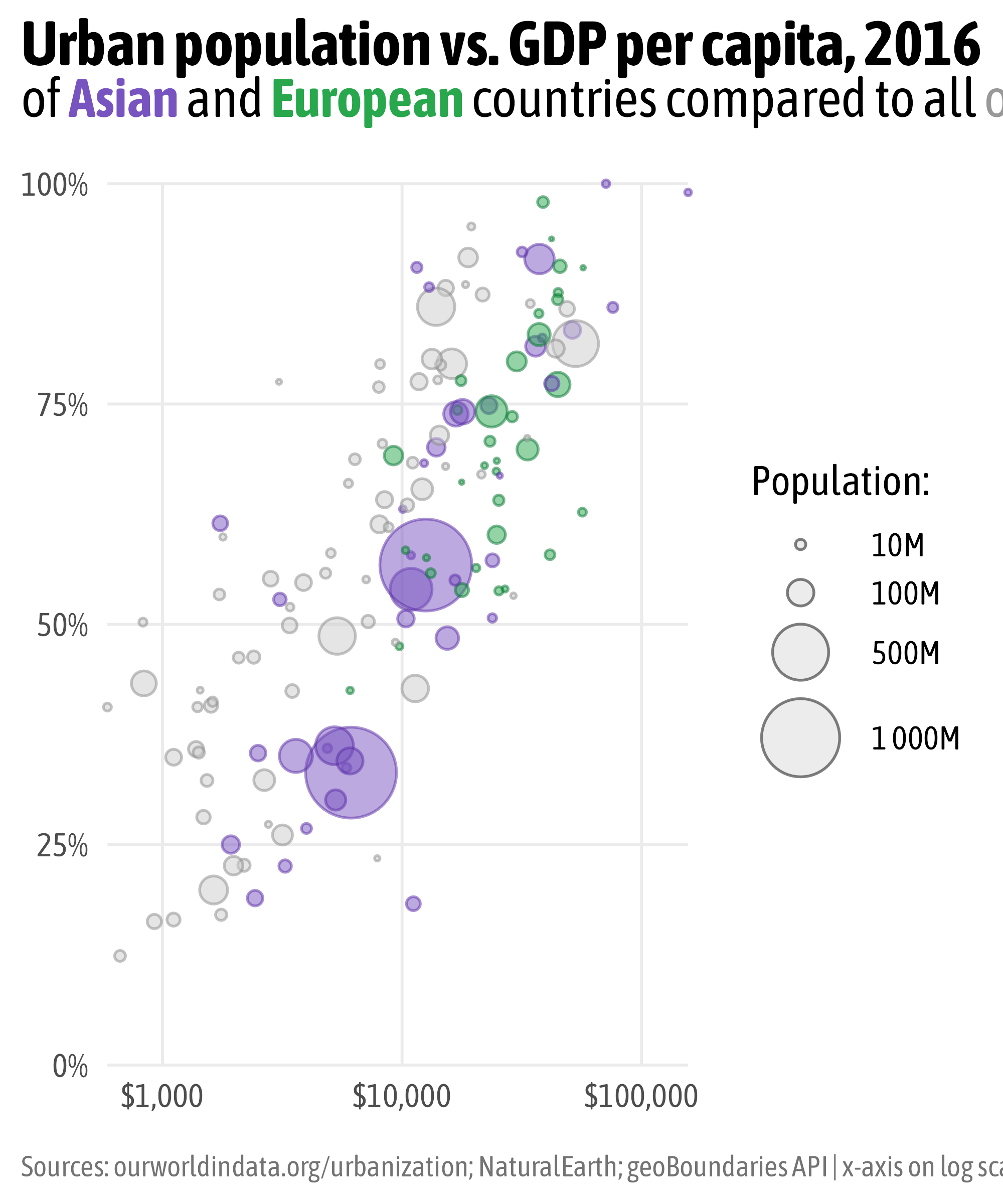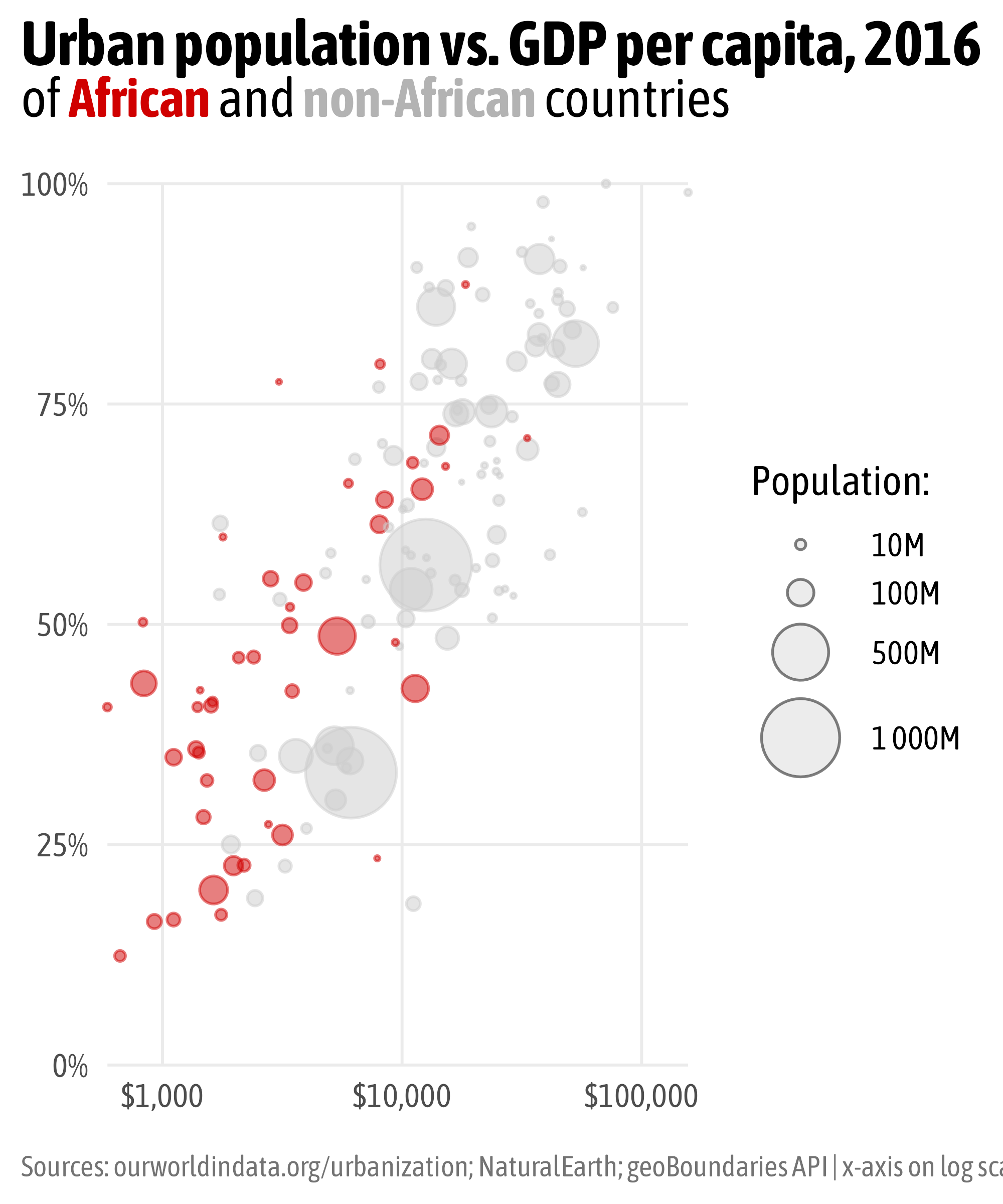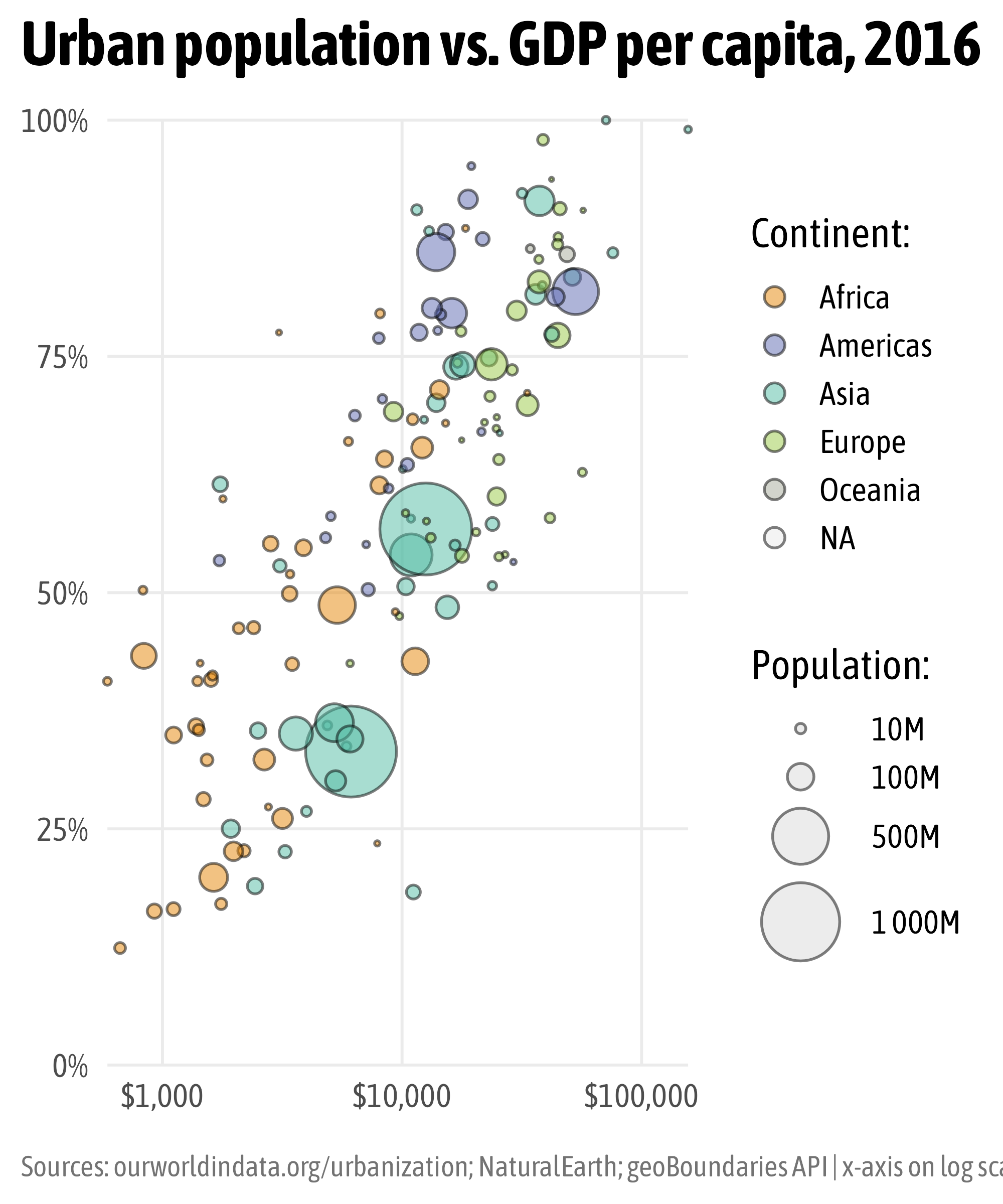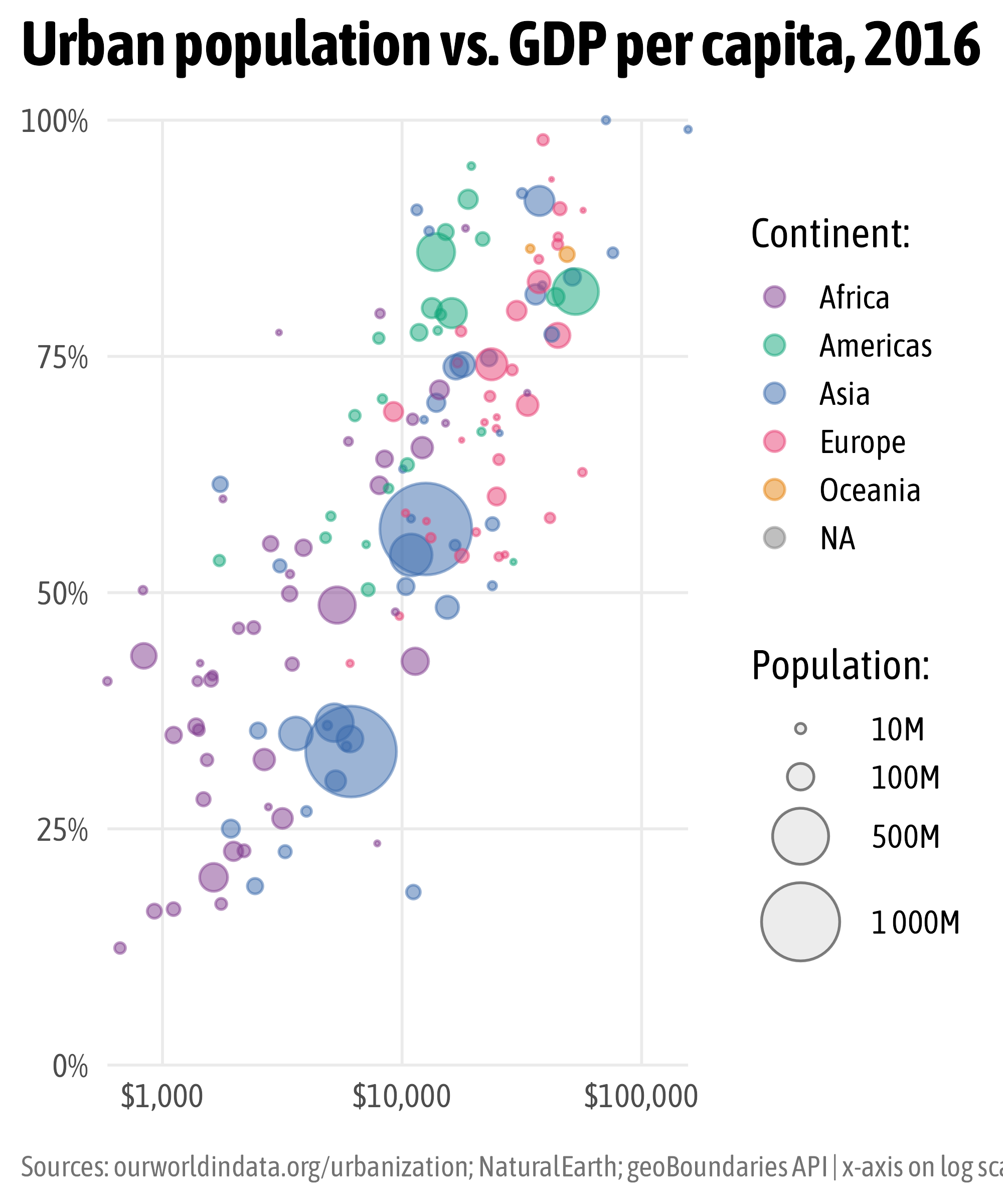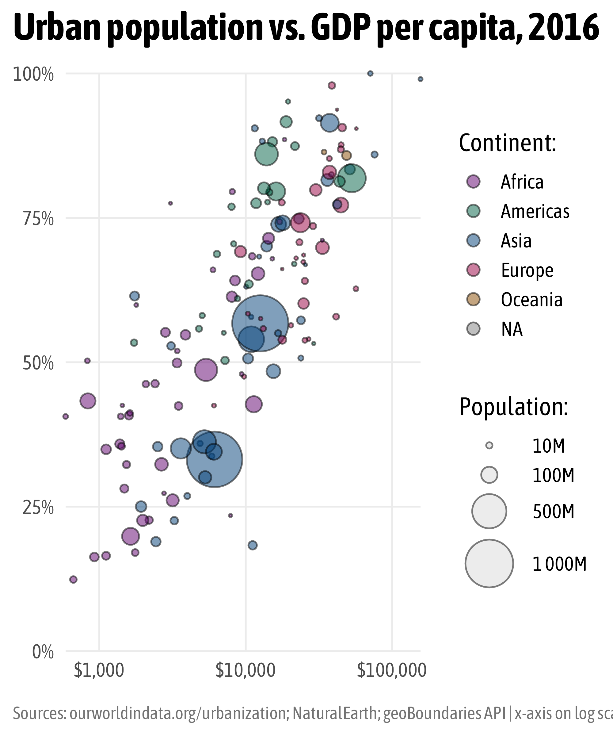 caption = "Sources: ourworldindata.org/urbanization; NaturalEarth; geoBoundaries API | x-axis on log scale") +