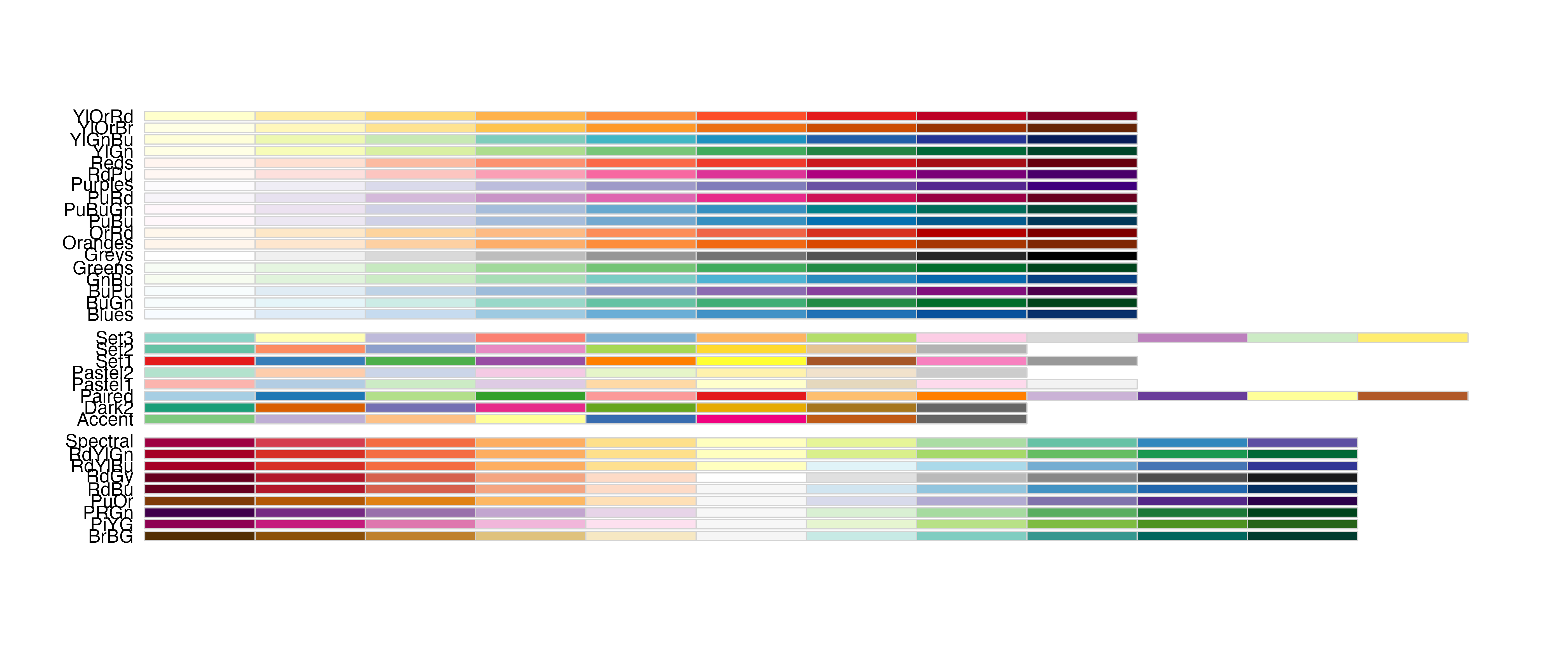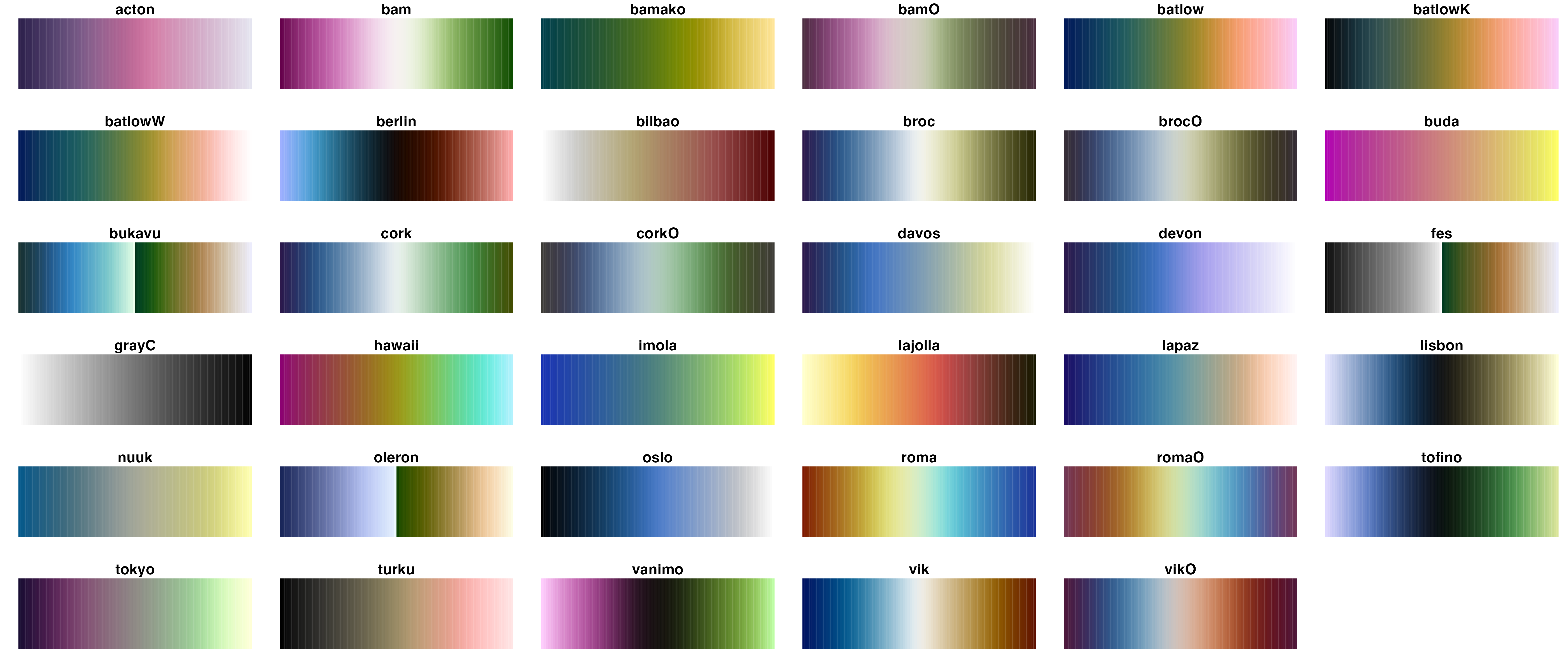 {dichromat} – for dichromats *{fishualize} – based on teleost fishes{ggsci} – based on scientific journal and Sci-Fi movies{ggthemes} – based on popular news rooms and software{ghibli} – based on Studio Ghibli movies{MetBrewer} – inspired by the Metropolitan Museum of Art{nord} – collection of northern inspired palettes{pals} – comprehensive collection of recommended palettes *{Redmonder} – inspired by Microsoft products *{wesanderson} – based on movies by Wes Anderson *library(ggplot2)